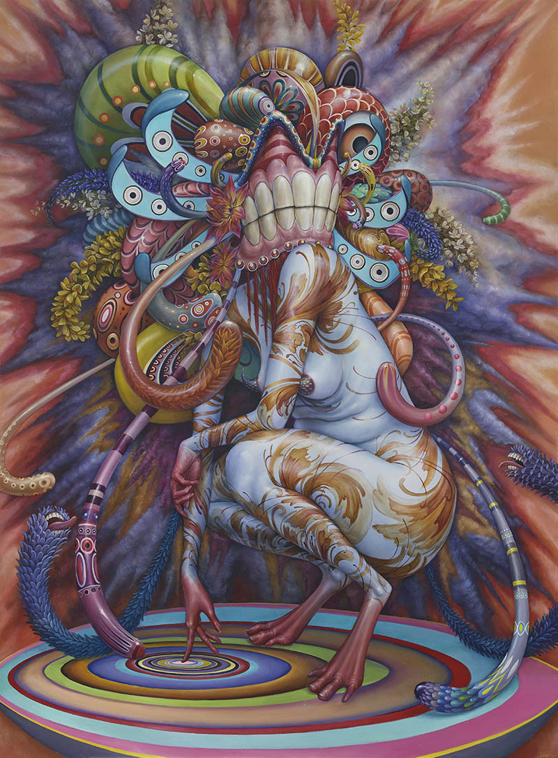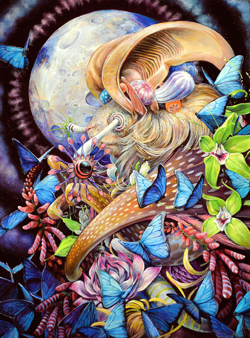 It's tough to pick out a favorite. It would be easy to say one of my larger pieces would be my favorite because of the amount of thought and energy I put into them. The scale also brings you to a different level in terms of exhilaration. However, if I were to pick out a piece that wasn't on a momentous scale, I would have to choose the Transfiguration. The expressions and energy in this piece give me so much delight. It also captures the essence of the psychedelic mushroom goddess that comes to me in this kind of Trickster personality.