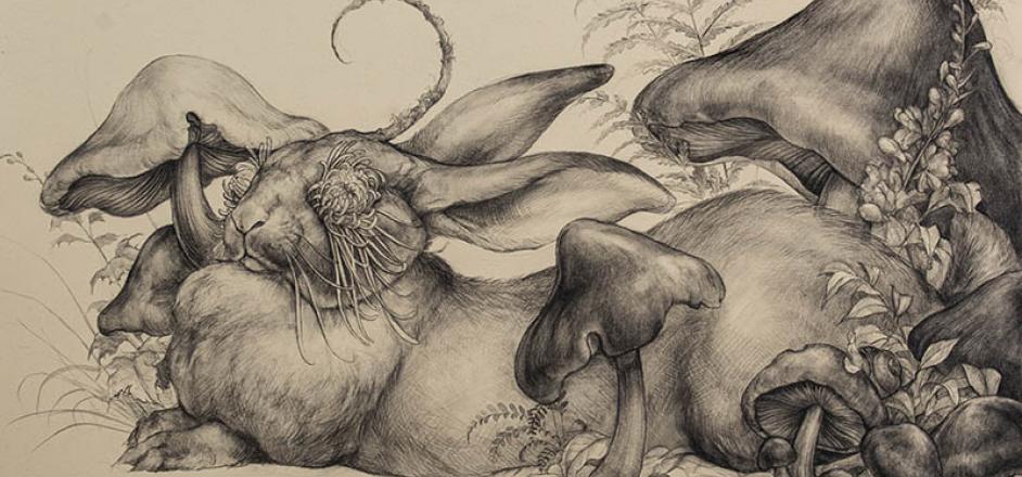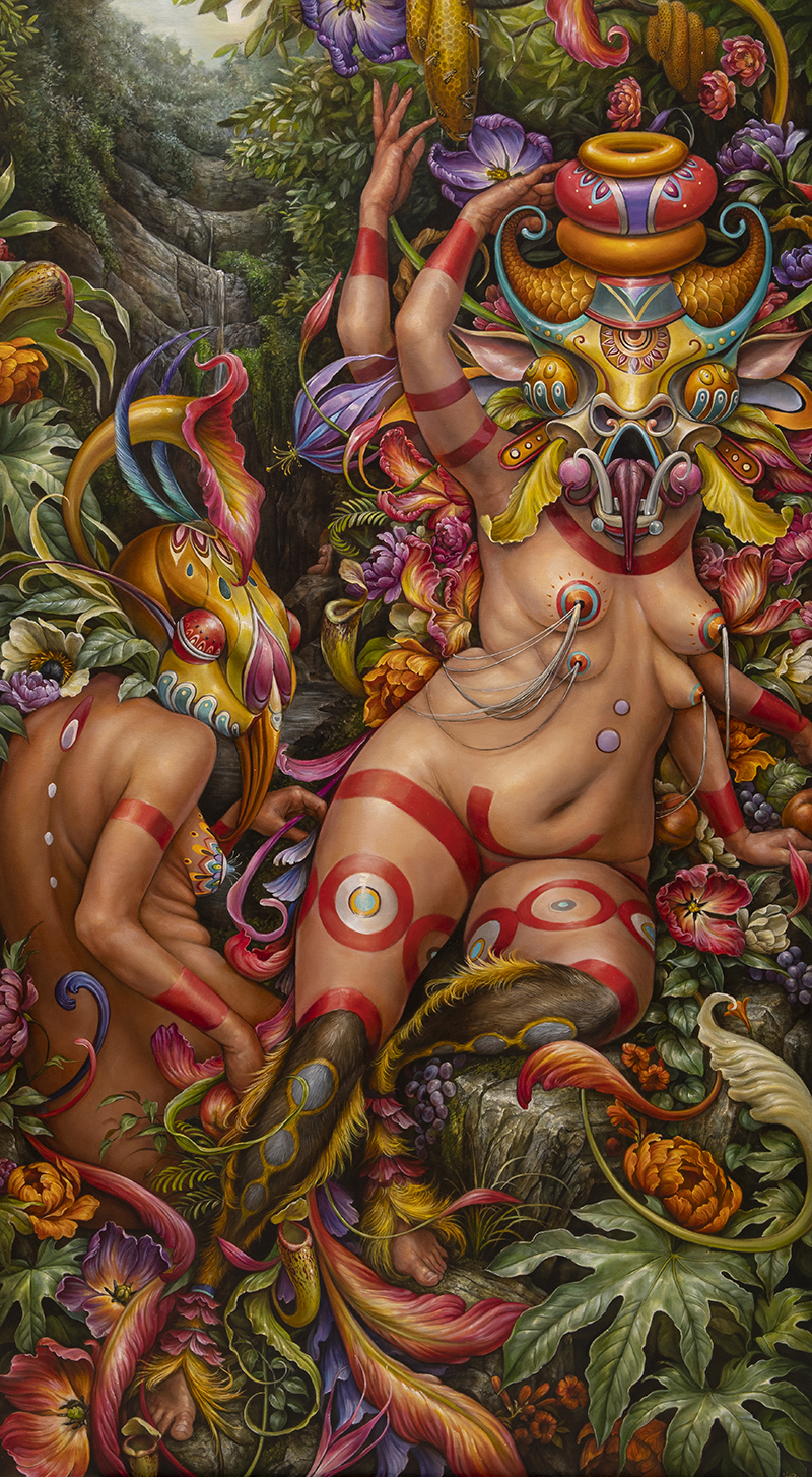 My hybrids of women, masks, and animal characters are the polymorphic faces of nature. It conceptualizes these spirits in anthropomorphic forms with a mix of symbolism, emotion, and reflection. Women are a potent symbol of the feminine, and the feminine is a creative force; an affirmation of life. Yet, she is also a symbol of change, death, seasons, and her body is a relationship to time and lunar phases. It's a deep well of feminine energy that I'm drawing from and still seeking to understand through the artistic process.