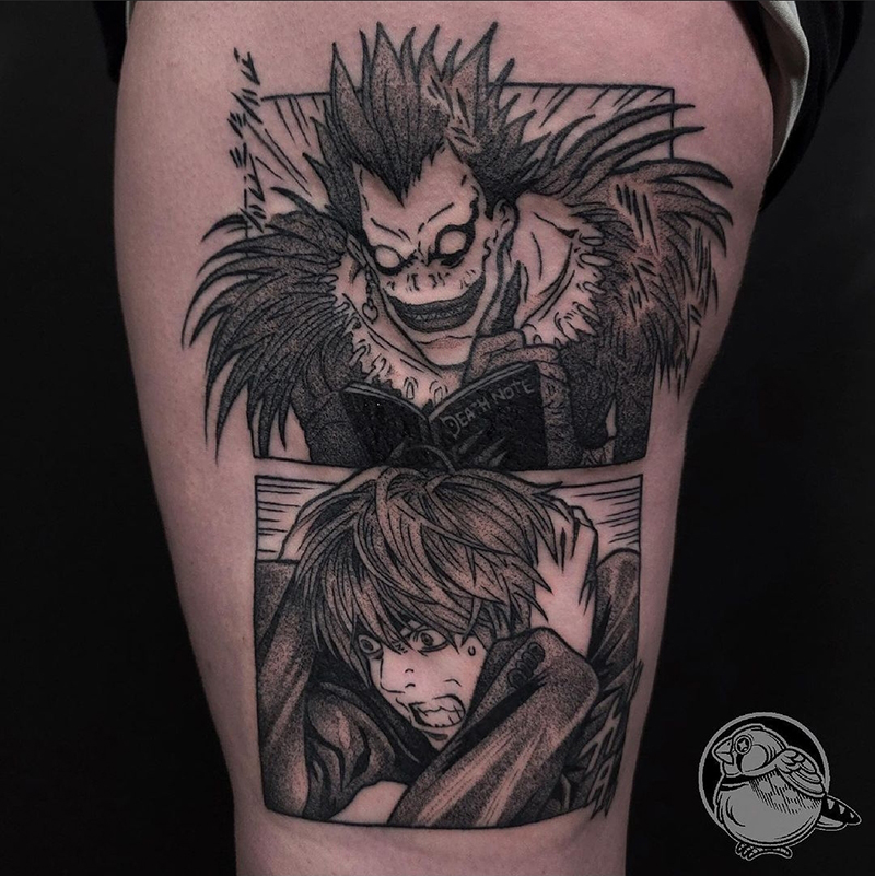My process varies depending on what the client wants. If a client wants a specific manga panel, my process is as simple as adjusting the original reference photo a little to make it more "tattooable" like making a speech bubble larger or adjusting some lines, then making a design straight from the reference. If someone wants a custom piece, I use a variety of reference photos of the character(s) to find a composition that I like then create a sketch based off that. Afterwards I refine my line drawing and do a little color rendering. Most importantly, I make sure I design something to flow well with the body part!