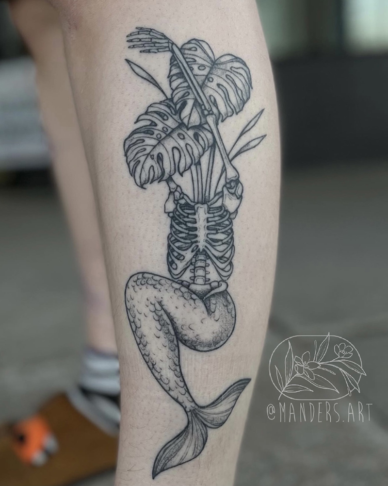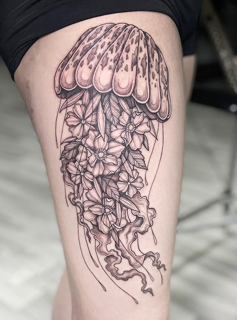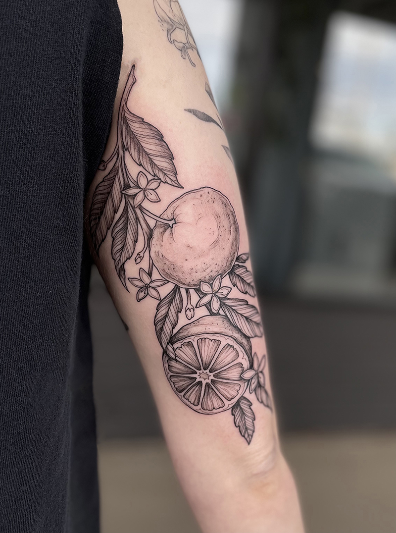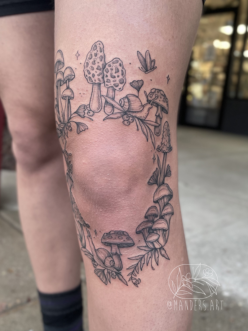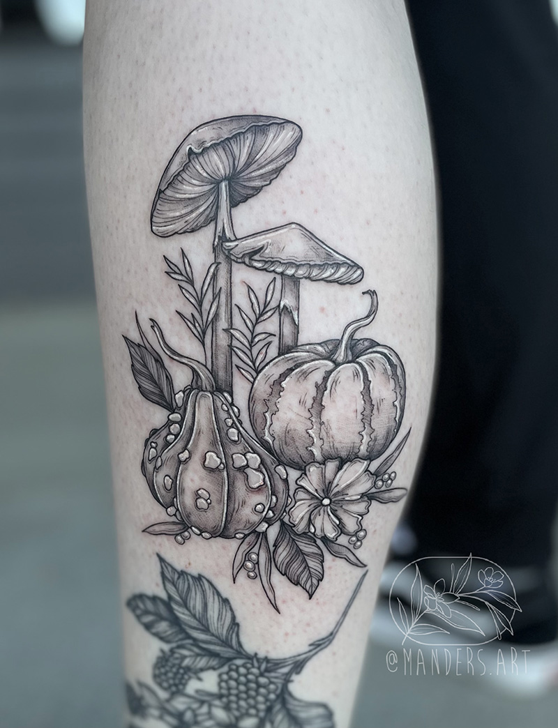 I really love all botanical pieces, but I’ve been really drawn to tropical plants, fruits, and mushrooms lately! I love the way organic elements flow with natural body curves and makes it look like the piece always belonged there! Skulls, skeletons, and anatomy are another favorite, because the little cracks and details in them are really fun to tattoo! Almost all of my pieces include some floral or botanical elements. I just love the way it ties back to nature!