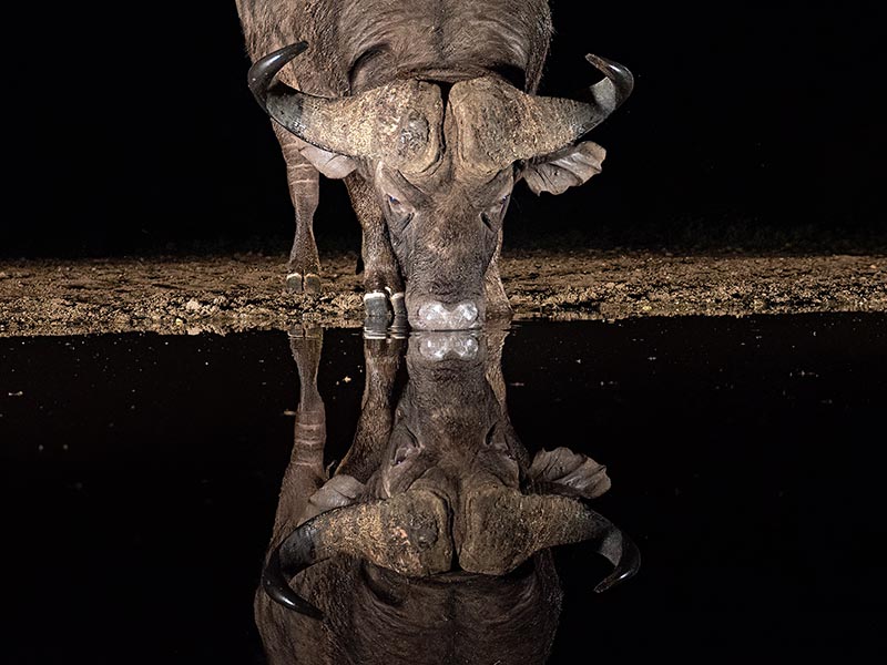 African buffalo taking a night time drink at a waterhole in Zimanga Game Reserve, South Africa. We were in a hide just 12 feet away from it, and waited several hours to get this shot.
