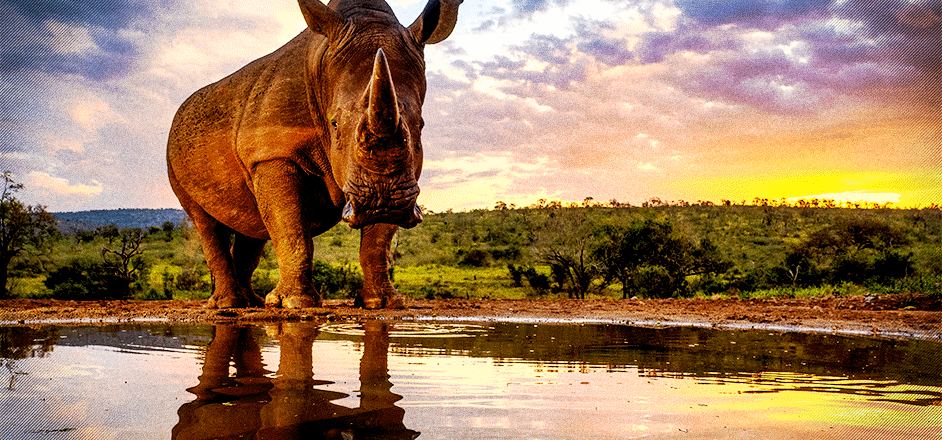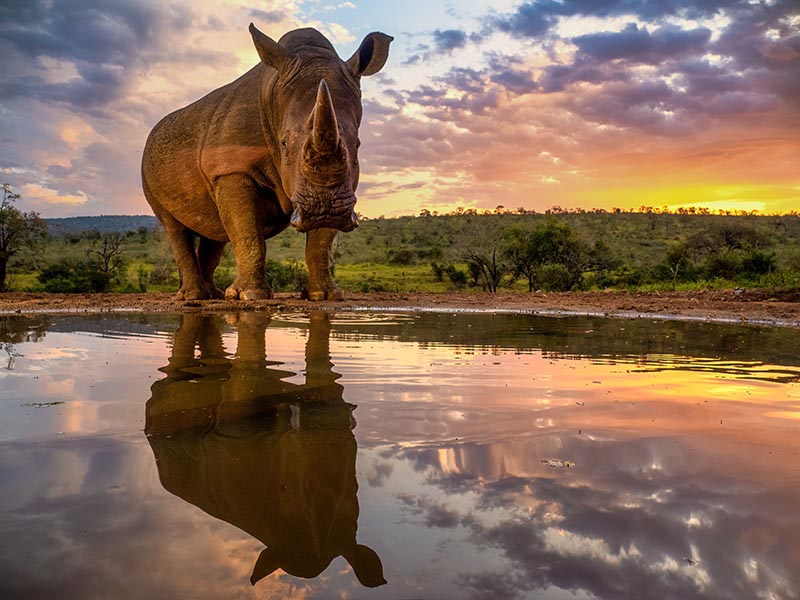 White rhino at a waterhole at sunset in Zimanga Game Reserve, South Africa. It was incredible to see such a huge and prehistoric looking animal so close up - we were just 12 feet away in a hide.