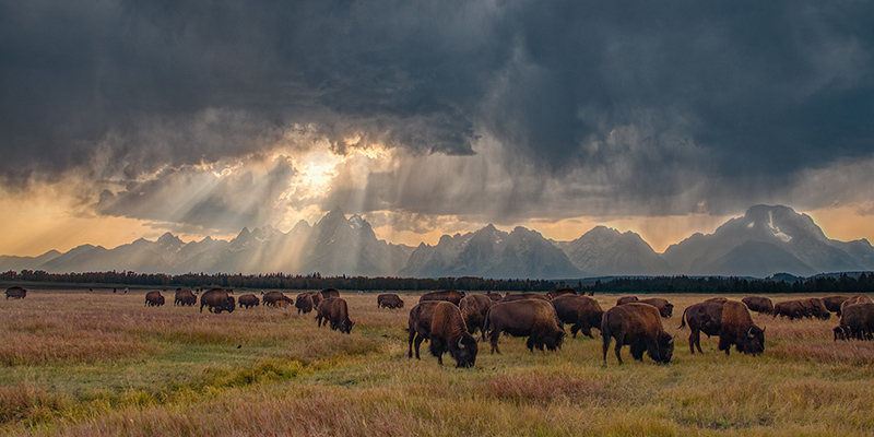 A herd of bison grazing in front of the Grand Teton mountain range, with a storm moving in at sunset. This is a shot that is really a moment in time that would be hard to reproduce, with the position of the bison in front of the mountains, the beautiful sunset and the storm moving in with sun rays through the clouds.