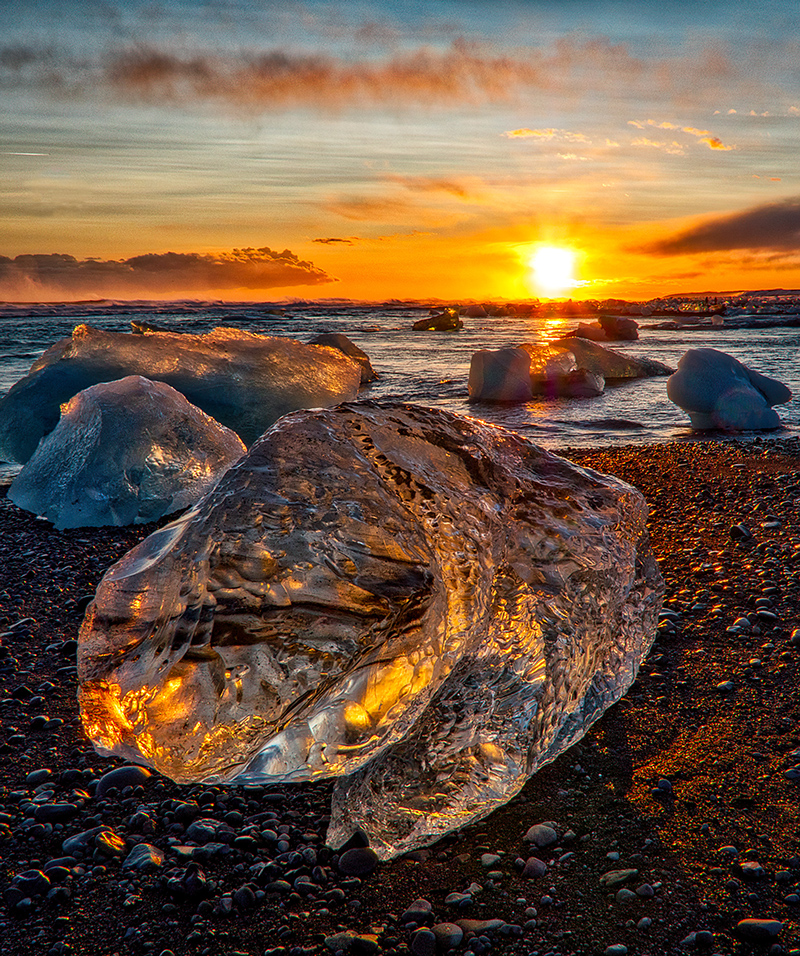 An ice boulder at sunset on Jökulsárlón beach in Iceland. Ice chunks from a nearby glacier get washed out to sea and form these beautiful boulders, which make up an amazing and constantly changing set of sculptures on the black pebble beach.