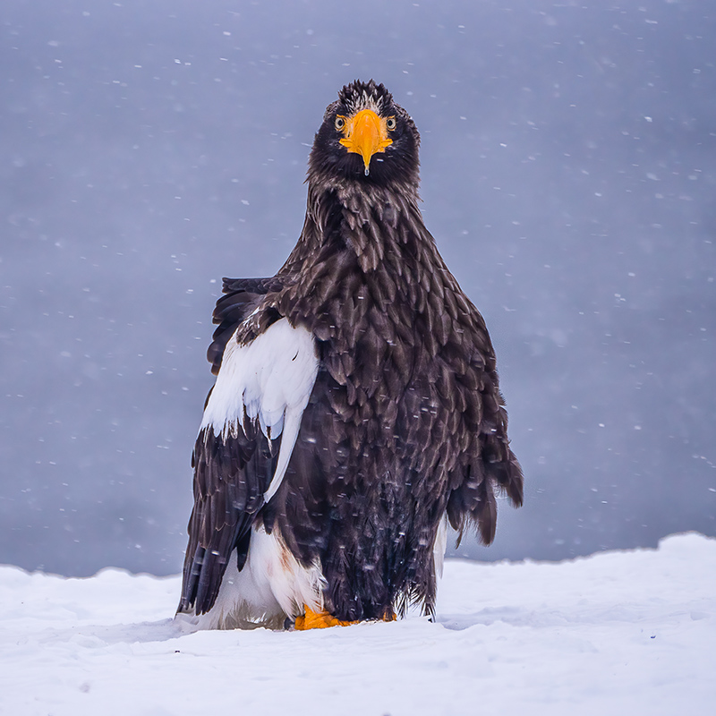 A Steller’s sea eagle on a snowy day on Hokkaido island, at the very northern tip of Japan. These are some of the largest eagles in the world and are only found in this small area of Japan and in the very remote Kamchatka Peninsula in far eastern Russia. I love its expression and the small icicle forming on its beak!