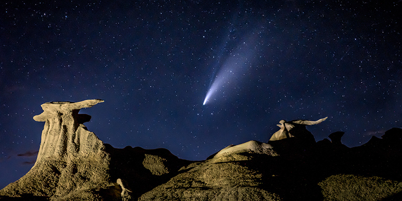 Comet NEOWISE above the Bisti Badlands in New Mexico. We backpacked in and camped overnight by these amazing rock formations to get images of the comet above the alien looking landscape.