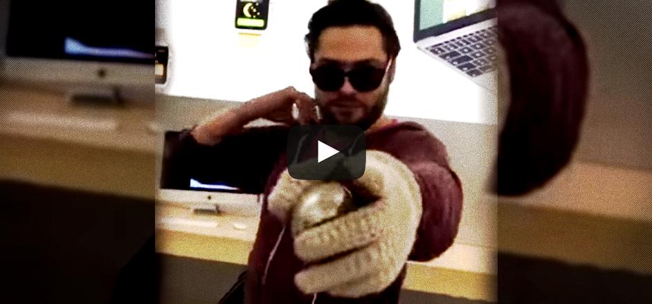 Except in this video. An unknown man was apparently frustrated with not getting the refund he demanded so he took a heavy metal ball (because he was carrying it in his bag for some reason?) and smashed the bejesus out of everything he could find in the Apple store.